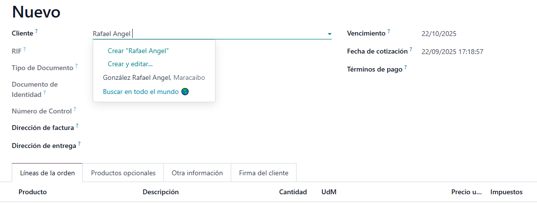 Primero, escriba el nombre del cliente en el campo Cliente que se encuentra en la parte superior del formulario.